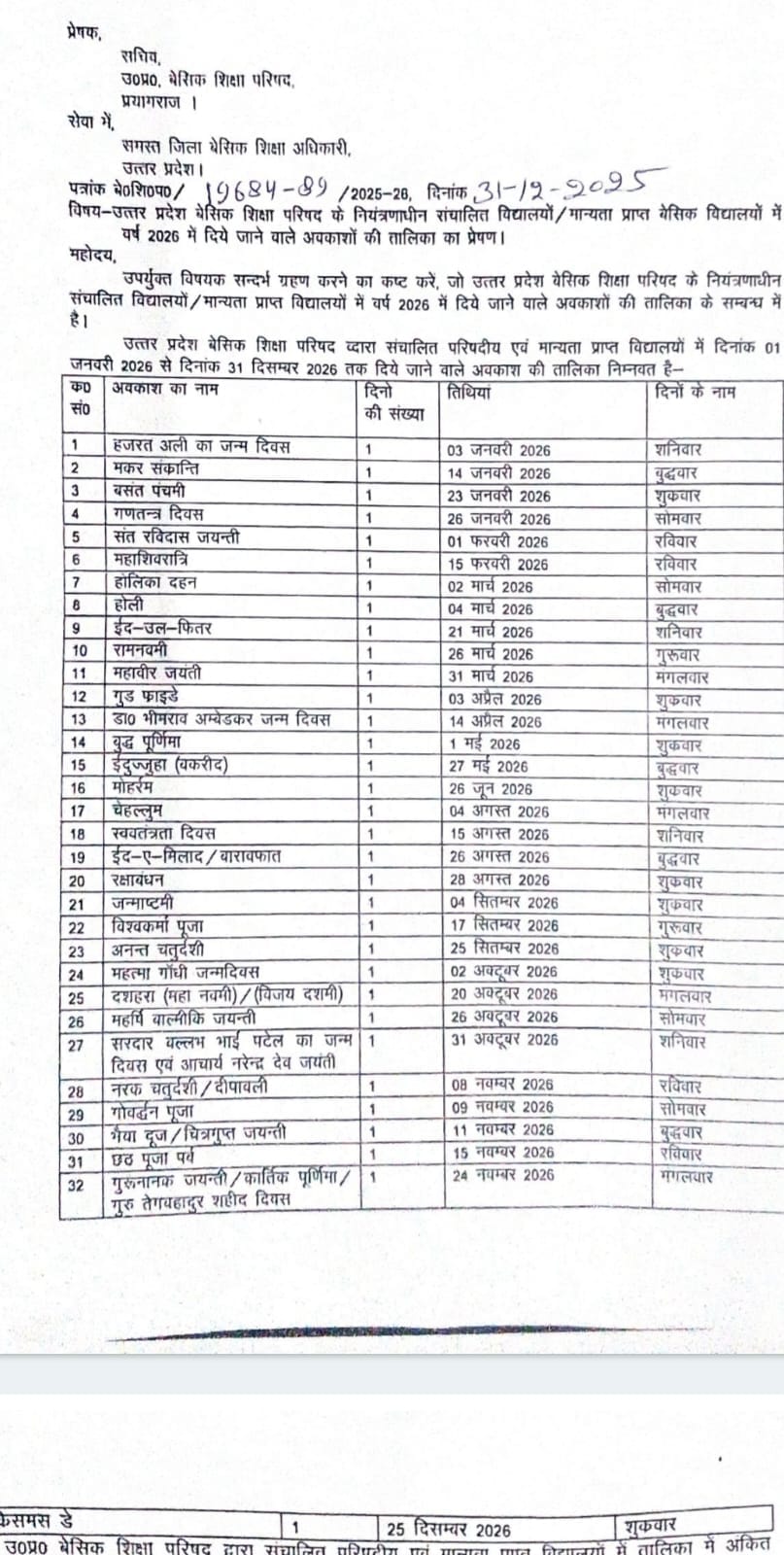 Basic Education Council has released the calendar of holidays for the new year 2026 in council and recognized basic schools of the state. Under this, there will be 33 days holiday in schools. However, the school will be opened one day each between the holidays of Holi and Diwali.